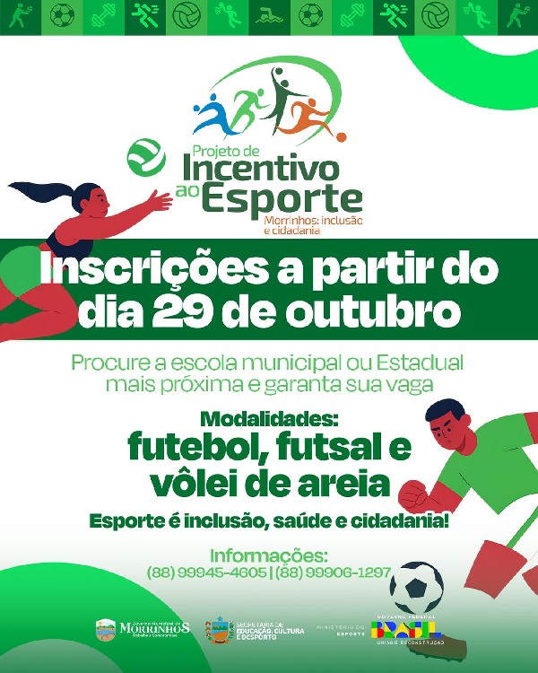 O Governo Municipal de Morrinhos, através da Secretaria de Educação, Cultura e Desporto, anuncia as inscrições para o Projeto de Incentivo ao Esporte, nas modalidades Futebol, Futsal e Vôlei de Areia.