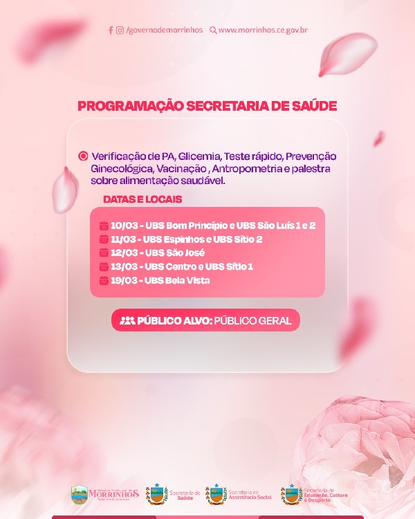 Em virtude da Semana da Mulher, o município de Morrinhos através das Secretarias de Saúde, Assistência Social e Educação, Cultura e Desporto preparou uma programação especial com ações voltadas ao cuidado, à prevenção e ao bem-estar de todas as mulheres do nosso município.