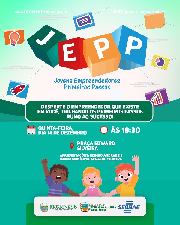 O Governo Municipal de Morrinhos, através da Secretaria de Educação, e em parceria com o SEBRAE, realizará nesta quinta-feira, 14 de dezembro, a Feira Municipal Jovens Empreendedores Primeiros Passos, com a participação das Escolas da Rede Municipal de Ensino e a Apresentação de Edinho Andrade e da Banda de Música Municipal. A Feira ocorrerá na Praça Edward Silveira, a partir das 18h30.