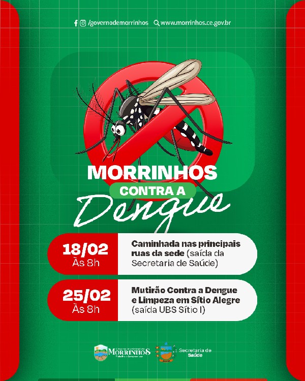 O Governo Municipal de Morrinhos, por meio da Secretaria de Saúde, realizará nos dias 18 e 25 de fevereiro a Campanha Morrinhos Contra a Dengue, com ações de prevenção e combate ao mosquito transmissor da dengue.